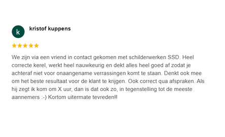 Wilt u beroep doen op een buitenhuis of binnenhuis schilder? SSD schilder- en decoratiewerken is gelegen in Sint-Niklaas. We staan bekend voor het leveren van top kwaliteit met oog voor detail binnen de afgesproken datum. Met al meer dan 16 jaar ervaring kunnen we met vertrouwen zeggen dat we behoren tot de beste schilders van Oost-Vlaanderen. Het is ook vanzelfsprekend dat SSD enkel gebruik maakt van top producten zoals BOSS PAINT en samenwerkt met professionele kleurenadviseurs voor al onze schilderwerken. SSD gaat bij elk project vakkundig te werk en neemt alle voorzorgsmaatregelen zoals de ondergronden beschermen en het inpakken van meubelen om verfspatten te vermijden.